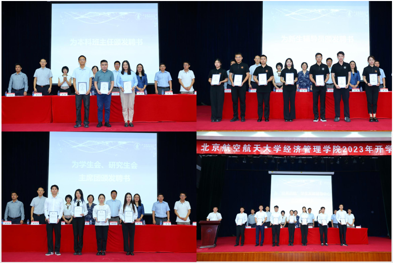 聘任仪式环节,副院长单伟宣读本科班主任名单,党委书记郑海涛宣读新生辅导员名单,副院长牟晖宣读学生会、研究生会主席团成员名单,副院长秦中峰宣读“经英启航”学生发展辅导中心主任名单,副院长郝金星宣读本科生学业梦拓、研究生顾问名单。与会领导和嘉宾为各位代表颁发了聘书。