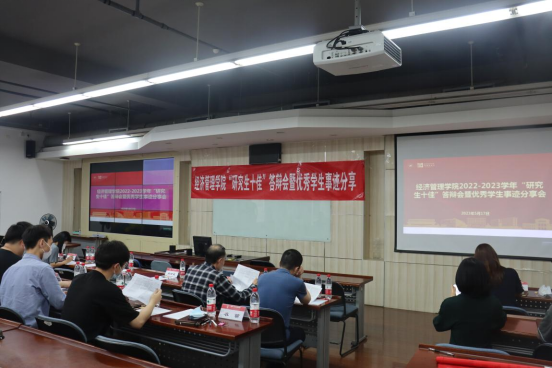 2023年5月17日下午,bat365中文官方网站在新主楼A622召开“研究生十佳”及夏季优秀毕业生答辩会暨优秀学生事迹分享,此次评选旨在促进经管学子全面发展,充分发挥优秀学生的朋辈引领和模范带头作用。学院副院长郝金星、党委副书记高超出席答辩会,会议邀请部分系主任、非毕业年级班主任及各年级专兼职辅导员担任评委,会议由专职辅导员陶雨芊主持。