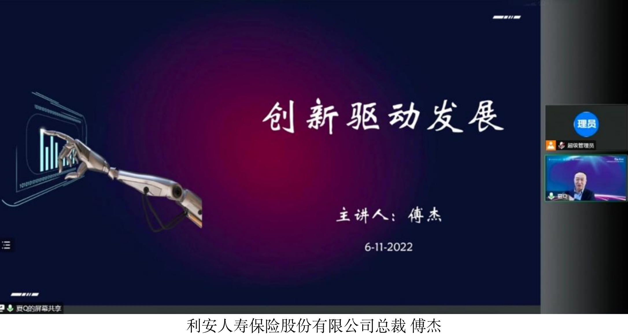 利安人寿保险股份有限公司总裁傅杰先生结合企业发展困境与动力带来《创新驱动发展》主题演讲。傅先生向大家分享了关于创新创业的五点感悟,分别为从无到有、人无我有、人有我专、人专我变、人变我恒。在企业创新方面,他强调:首先要主动,及时洞察行业动态,直面市场,积极求变,以创新推动企业持续稳定地发展;其次要守正,避免创新陷阱。创新不是投机取巧,不能走捷径,不能朝三暮四;最后要自主,创新要从企业自身角度出发,坚持选择适合自身的创新路线,切勿实行“拿来主义”,随波逐流。