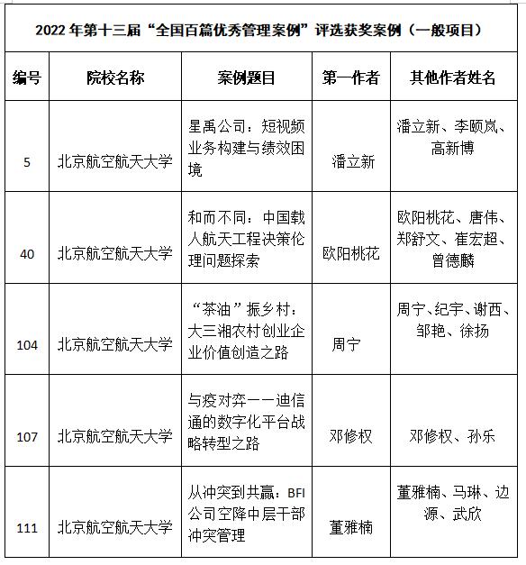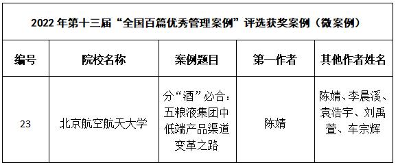 2022年9月4日,由全国工商管理专业学位研究生教育指导委员会举办、中国管理案例共享中心承办的第十三届“全国百篇优秀管理案例”评选工作结束。经过同行匿名函审和专家委员会会议评审两轮评审,从176所院校的1395篇投稿中评选出190篇获奖案例。其中,117篇案例入选第十三届“全国百篇优秀管理案例”,40篇案例入选第十三届“全国百篇优秀管理案例”(微案例)。北航经管学院共有5篇案例入选“全国百篇优秀管理案例”(一般项目),1篇案例入选“全国百篇优秀管理案例”(微案例)。
