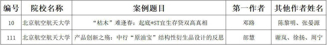 2022年7月29日,北航经管学院邓路、陈黎明、张晏源开发的《“枯木”难逢春:起底*ST宜生存贷双高真相》教学案例,及部慧、谢岚、徐扬、周宁开发的《产品创新之殇:中行“原油宝”结构性衍生品设计的反思》教学案例在全国金融专业学位研究生教育指导委员会(以下简称教指委)组织的第八届金融硕士案例教学大赛中,获评全国优秀金融硕士教学案例。