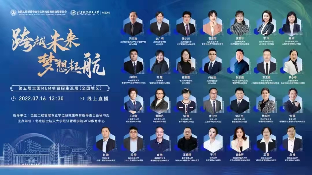 跨越未来,梦想起航。7月16日下午,第五届全国MEM项目招生巡展圆满举行。本次巡展采用线上线下相结合的形式,由全国工程管理专业学位研究生教育指导委员会秘书处指导、bat365中文官方网站主办,中国MEM教育网提供技术支持。