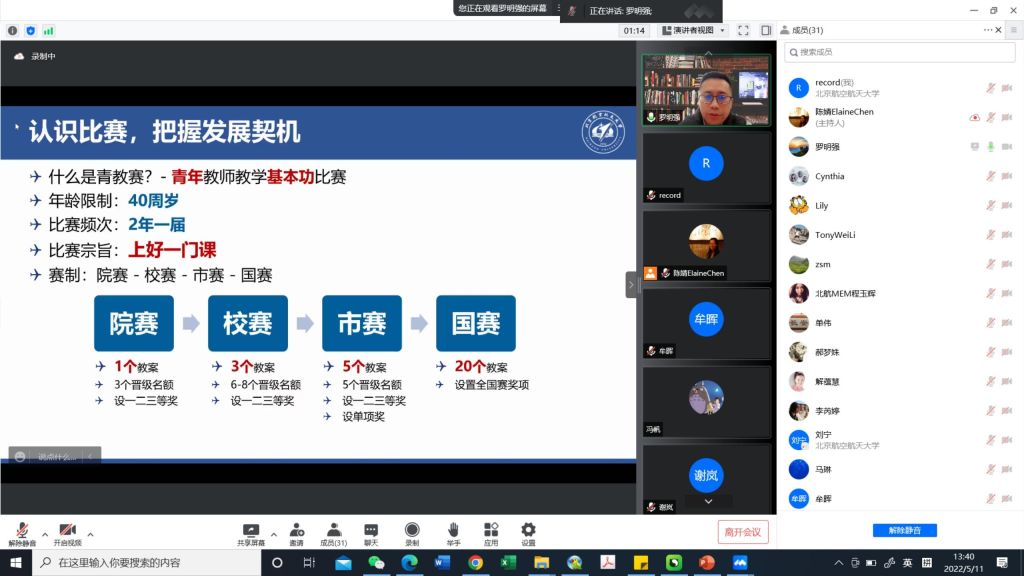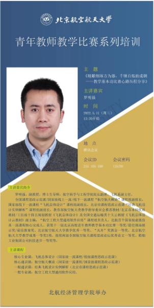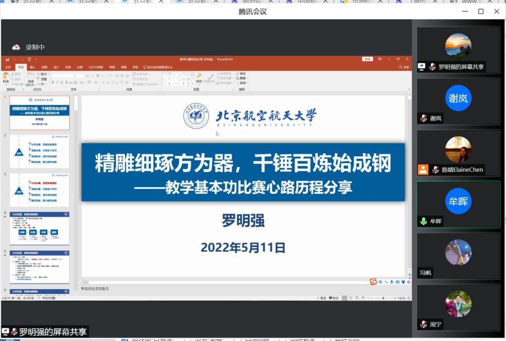 5月11日下午,经管学院以腾讯会议的方式组织了青年教师教学比赛第二次赛前培训活动。本次培训邀请到了航空科学与工程学院院长助理、飞机系副主任罗明强进行经验分享。经管学院副院长牟晖主持此次会议,经管学院工会主席谢岚、会计系教授周宁及30余位青年教师参加了此次活动。
