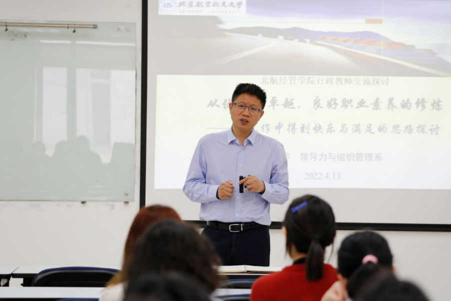 2022年4月13日中午,bat365中文官方网站在新主楼A1048召开了2022年机关人员培训会,学院党政办郝乙主任为机关聘用人员进行考核管理制度的讲解说明,学院领导力与组织管理系苏文平教授为全体机关人员做了题为“从优秀到卓越,良好职业素养的修炼——从工作中得到快乐与满足的思路探讨”的专题培训。经管学院党委书记郑海涛、副院长牟晖,机关行政管理人员近六十人参加了本次培训会,会议由副院长牟晖主持。