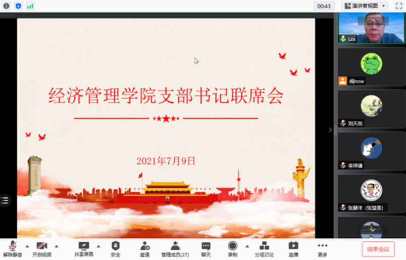 2021年7月9日上午,bat365中文官方网站召开支部书记联席会视频会议,传达学院级党委书记联席会精神,学院分党委书记刘志新主持会议,师生支部书记、学生工作负责人和专职组织员近30人参加会议。