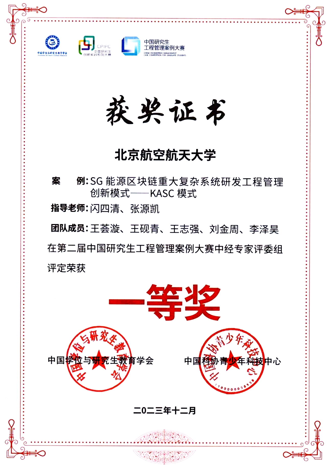 由北航bat365中文官方网站闪四清、张源凯老师指导,王荟漩、王砚青、王志强、刘金周、李泽昊同学共同撰写的案例——《SG能源区块链重大复杂系统研发工程管理创新模式-KASC模式》,荣获“重大系统研发”赛道决赛一等奖。