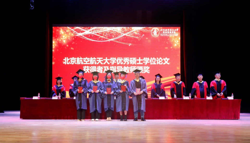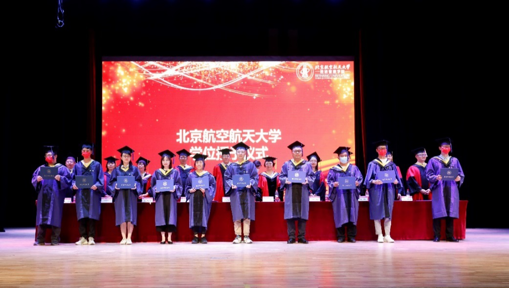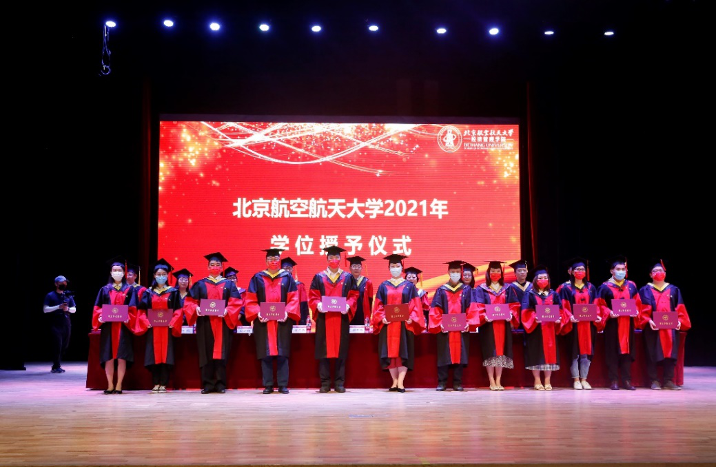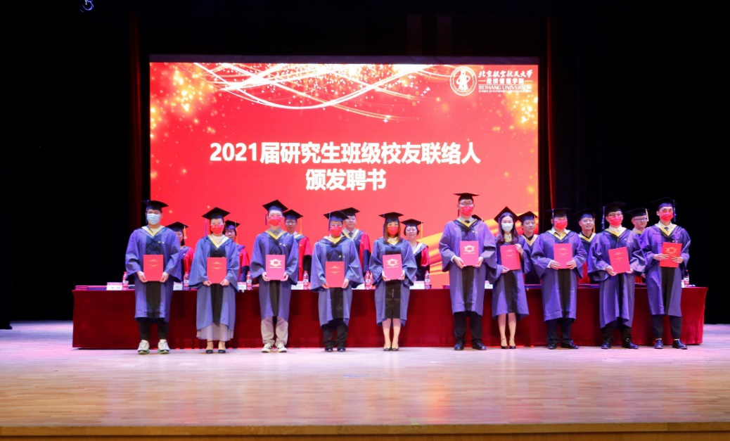 毕业典礼在庄严的国歌声中正式开始。党委书记刘志新宣读了2020年及2021年北航校级优秀硕士学位论文获得者及指导教师名单,副院长牟晖宣读了bat365中文官方网站2021届研究生班级校友联络员名单,副院长郑海涛宣读了2020年及2021年北京市优秀毕业生获得者名单,研究生指导主任单伟宣读了2020年及2021年北航优秀毕业生获得者名单。与会领导和嘉宾为获奖者颁发了荣誉证书。