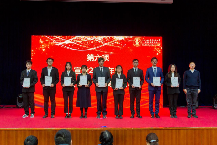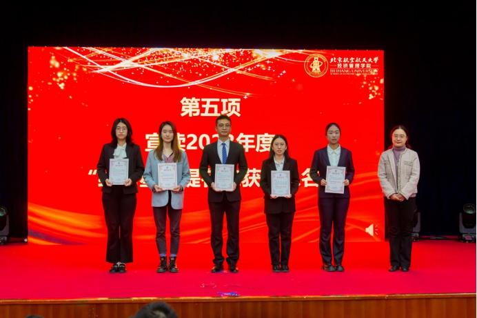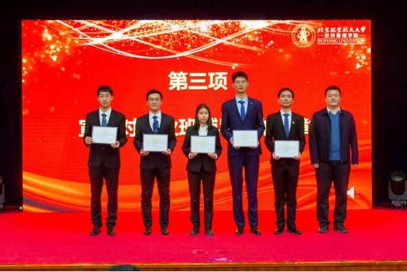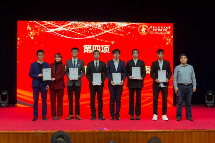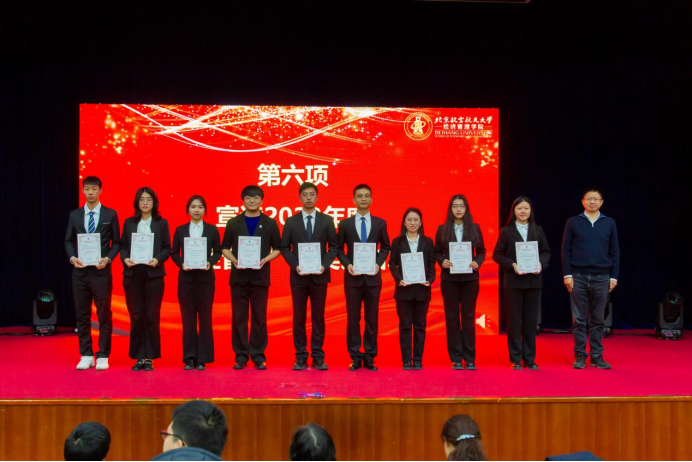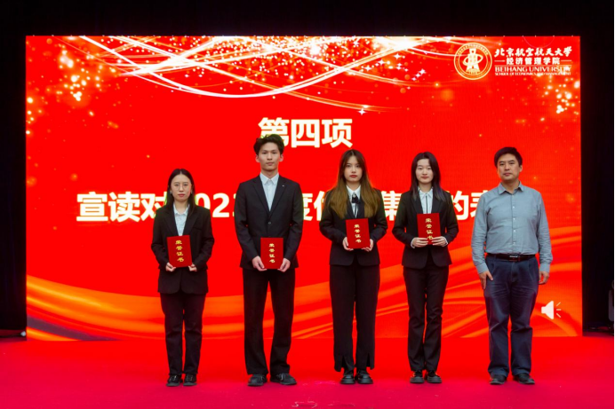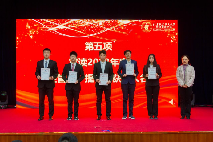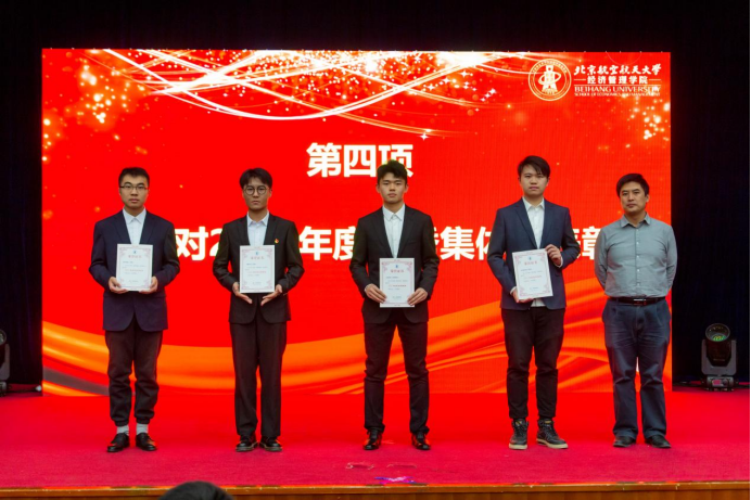 大会第四项,郝金星老师宣读2023年bat365中文官方网站优秀集体名单并为获奖集体颁奖,表彰学院各团队在学术研究、社会实践、文体活动等方面取得的骄人成绩。他们分别是:学院党员先锋队——“防金融诈骗”宣讲团、“经英悦动”体育服务队、“读懂中国”实践队、志愿服务队;中国大学生排球联赛季军——北航女子排球队;首都高校足球联赛季军——北航男子足球队;中国研究生企业管理创新大赛一等奖队伍——MBA-“创新探路者”队;北京市先进班集体——200816班;暑期社会实践校级一等奖——北航文博馆实践队;校级十佳宿舍——D5-402C宿舍;学院“经英启航”学生发展辅导中心——全体学生骨干团队。