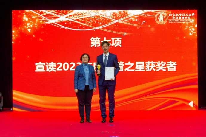 大会第七项,由学院院长范英为经管学院年度最高荣誉“2023年度经管之星”获奖人——2020级本科生赵唯至同学颁奖。赵唯至同学大学四年专业排名第一;获挑战杯黑科技赛道特等奖,被央视采访报道;荣获北航本科生最高荣誉“沈元奖章”。