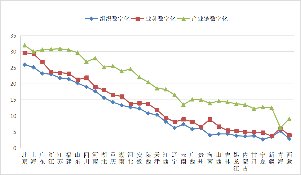 《报告》公布了31个省(市、区)的中小企业数字化指数得分及排名,14个省(市)指数值高于平均水平,北京市超越广东,跃居中小企业数字化指数第一名,上海市、广东省、浙江省、江苏省、福建省紧随其后,中小企业数字化指数头部省市基本确定。