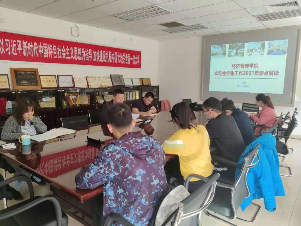 会议讨论确定了2021年的重点工作,主要包括:构建学生工作体系,建设“1办+9中心”,对应落实学生党建、学风学业、实践育人、学生干部培训、积极心理、资助育人、学生权益和文体活动等9方面工作;开展庆祝建党百年系列活动;完善学业支持中心建设;厚植情怀,做好劳动教育,突出实践,开展“经管+”行动计划;深入学生开展调查研究;做好全过程贯通式生涯指导;全面落实“三横三纵”工作体系,强化学院基础制度建设;做好重点关注学生关心关爱工作、压实责任,严守安全底线。