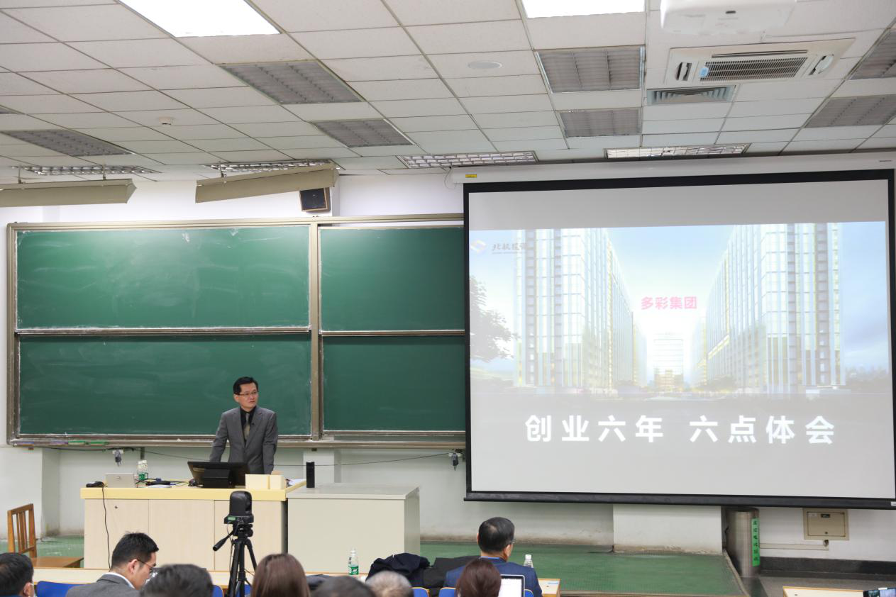 本期课程的第一讲特别邀请到北航企业家俱乐部会长、北航投资有限公司董事长、深圳多彩实业集团董事长夏炜,为大家做题为《创业六年,六点体会》的主题报告。北航集成电路科学与工程学院院长赵巍胜、中国民航信息网络股份有限公司董事会秘书于晓春、北航投资有限公司总经理王剑飞、北航MBA教育中心主任李亚帅、副主任胡鹤等到场聆听。课程负责人经管学院牟晖老师主持本次报告,300余名师生现场参与,并在抖音进行了在线直播。