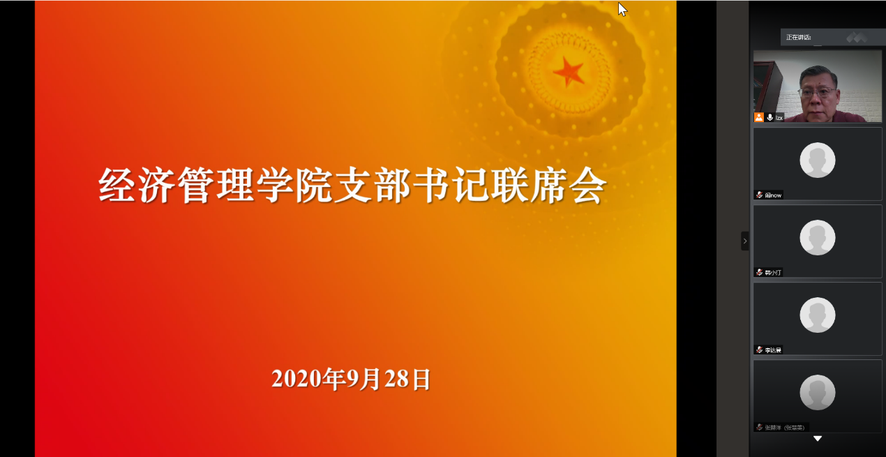 2020年9月28日下午4时,bat365中文官方网站召开支部书记联席会,传达学校分党委书记联席会精神并组织集中学习,学院分党委书记刘志新主持会议,全体师生党支部书记、学生工作负责人和专职组织员40余人参加会议。