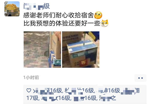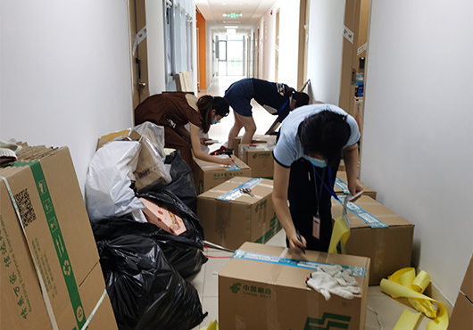 精准施策,贴心周到。为确保打包运送无误,各工作组及时征集学生的打包意愿,协商好打包时间,做到点对点沟通。在打包过程中,全程与学生进行视频连线,耐心细致与同学沟通,每一个角落、每一件物品都不错过。大到被子、床头柜、电脑,小到衣架、计算器、签字笔,从书架上的书籍到床下的鞋袜,只要学生们需要,无论物品大小,都耐心寻找,细心挑拣,保证所有物品细心整理、精心打包。对于重要证件和文件、易碎物品和贵重物品都进行妥善处理,充分尊重学生的个人意愿。