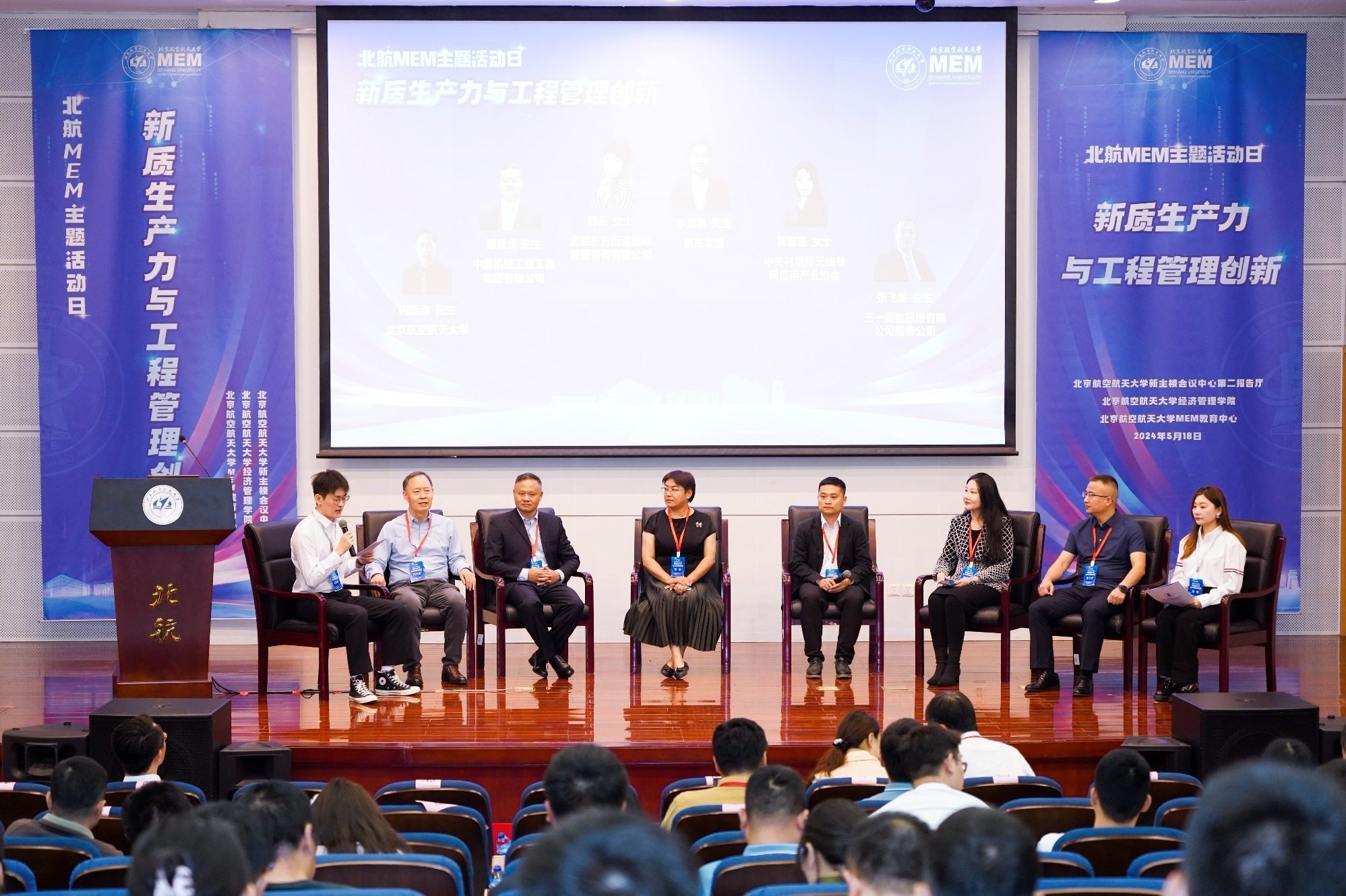 本次行业对话以《新质生产力与工程管理创新》为主题,受邀参与此环节的嘉宾有京东集团供应链产品研发部产品总监李清泉先生、北京东方迈道国际管理咨询有限公司总经理韩燕女士、中国机械工业工程集团有限公司事业部商务总监鄢盛虎先生、中关村宽带无线专网应用产业协会秘书长兼法人代表薛珊珊女士、三一重能股份有限公司服务公司副总经理张飞龙先生、bat365中文官方网站MEM教育中心主任闪四清教授,此环节由北航MEM2023级董佳伟同学和常萌同学共同主持,代表同学们与各位行业专家进行互动交流。各位专家结合自身从业经验对新质生产力与工程管理创新话题进行了详实的阐述,全程干货、掌声不断。