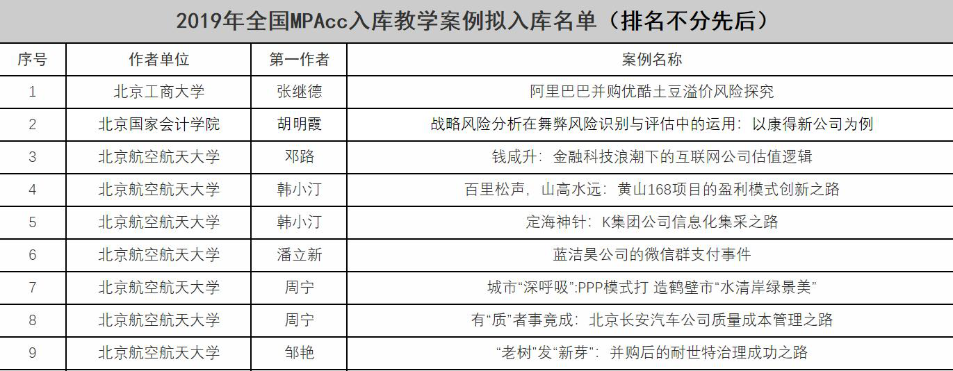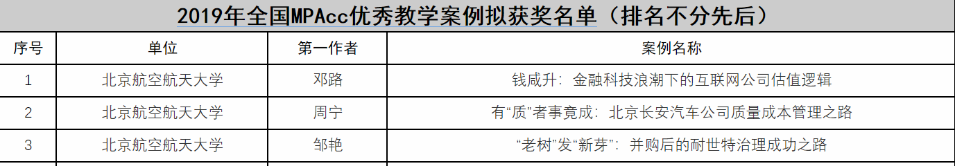 近日,2019年全国MPAcc优秀教学案例、入库教学案例拟获奖名单公布,bat365中文官方网站经管学院推荐的参评案例中,共有三篇案例获奖,七篇案例入库,并首次获得全国优秀组织奖。本次MPAcc优秀教学案例评选,全国高校共计申报730余篇教学案例,经过全国会计专业学位研究生教指委组织的形式审查、匿名通讯评审、线上会议集中评审,最终评选30篇全国MPAcc优秀教学案例,经管学院获奖案例数占总获奖篇数的10%,展示了经管学院持续推动案例开发和案例教学取得的重要成果。
