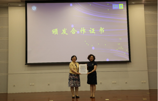 范英院长向澳洲会计师公会北京代表处首席代表孟文静老师颁发了合作证书,标志着双方合作的进一步加深。孟文静老师在致辞中分享了她对于会计行业数字化转型趋势的深刻见解,以及她对未来双方合作在培养数智化会计人才、推动行业创新与发展方面的期待。