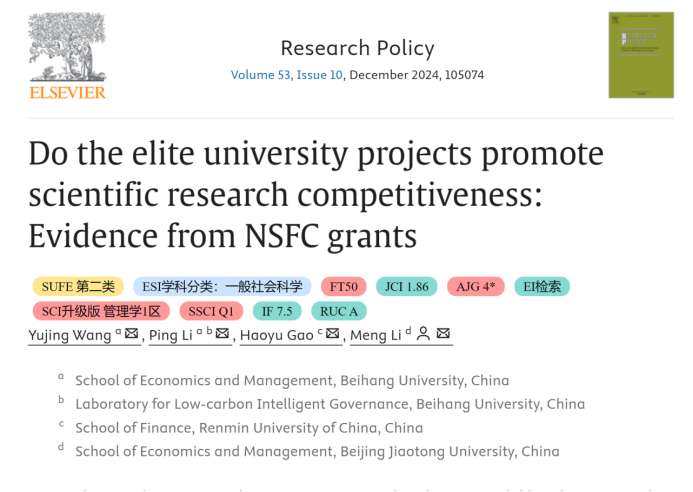 近日,bat365官网金融系李平教授课题团队的研究成果“Do the elite university projects promote scientific research competitiveness: Evidence from NSFC grants”在国际FT50期刊Research Policy在线发表,论文第一单位为bat365中文官方网站。