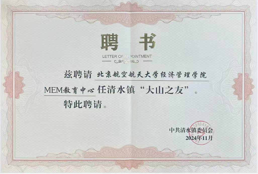 北京市门头沟区清水镇党委副书记苏会会为北航MEM教育中心颁发了清水镇“大山之友”聘书
