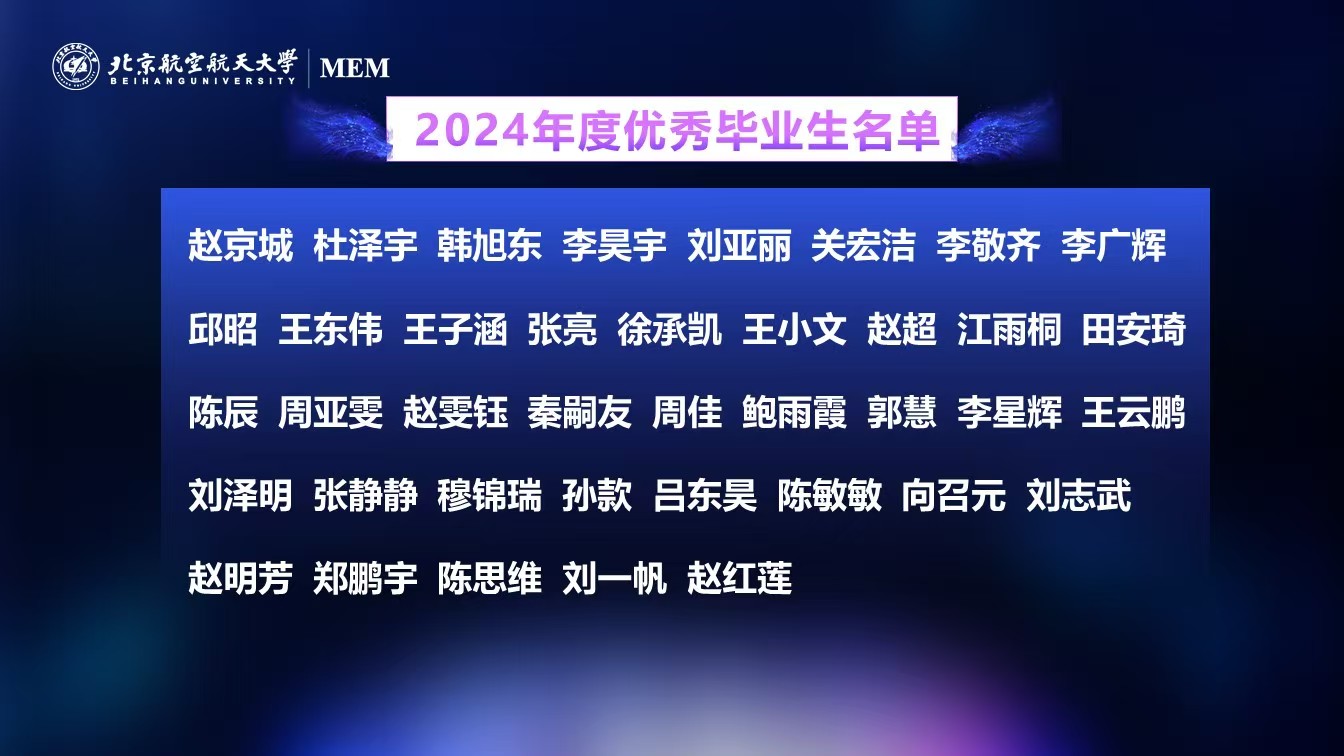 在2024年春季和夏季的毕业季,8名MEM学生获得“北京市优秀毕业生”,31名MEM学生获得“北航优秀毕业生”荣誉称号。现场,北航MEM教育中心主任闪四清宣读了2024年度优秀毕业生名单,希望同学们以榜样为引领,凝聚奋进力量,志存高远、追求卓越。至此,北航MEM2024年度总结会圆满结束。