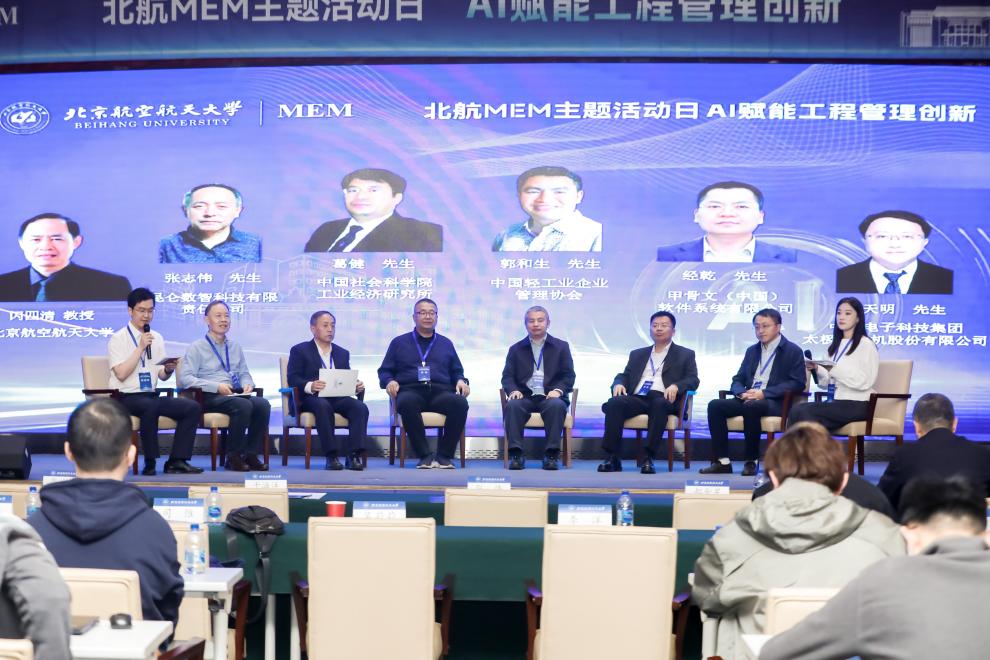 本次行业对话环节邀请了中国轻工业企业管理协会副理事长兼秘书长郭和生先生,中国社会科学院工业经济研究所副研究员葛健先生,甲骨文(中国)软件系统有限公司建筑与工程全球事业部行业解决方案总监经乾先生,中国电子科技集团太极计算机股份有限公司智能制造事业部副总经理战天明先生,昆仑数智科技有限责任公司首席技术专家张志伟先生,bat365中文官方网站MEM教育中心主任闪四清教授共同参与。此环节由北航MEM2024级程靖雯同学和焦道伟同学担任学生主持,代表同学们与各位行业专家进行互动交流。各位行业专家围绕“AI赋能工程管理创新”这一主题展开了深入探讨,并结合自身从业经验分享了不同领域的AI实践创新与发展,全程干货满满,现场掌声不断。