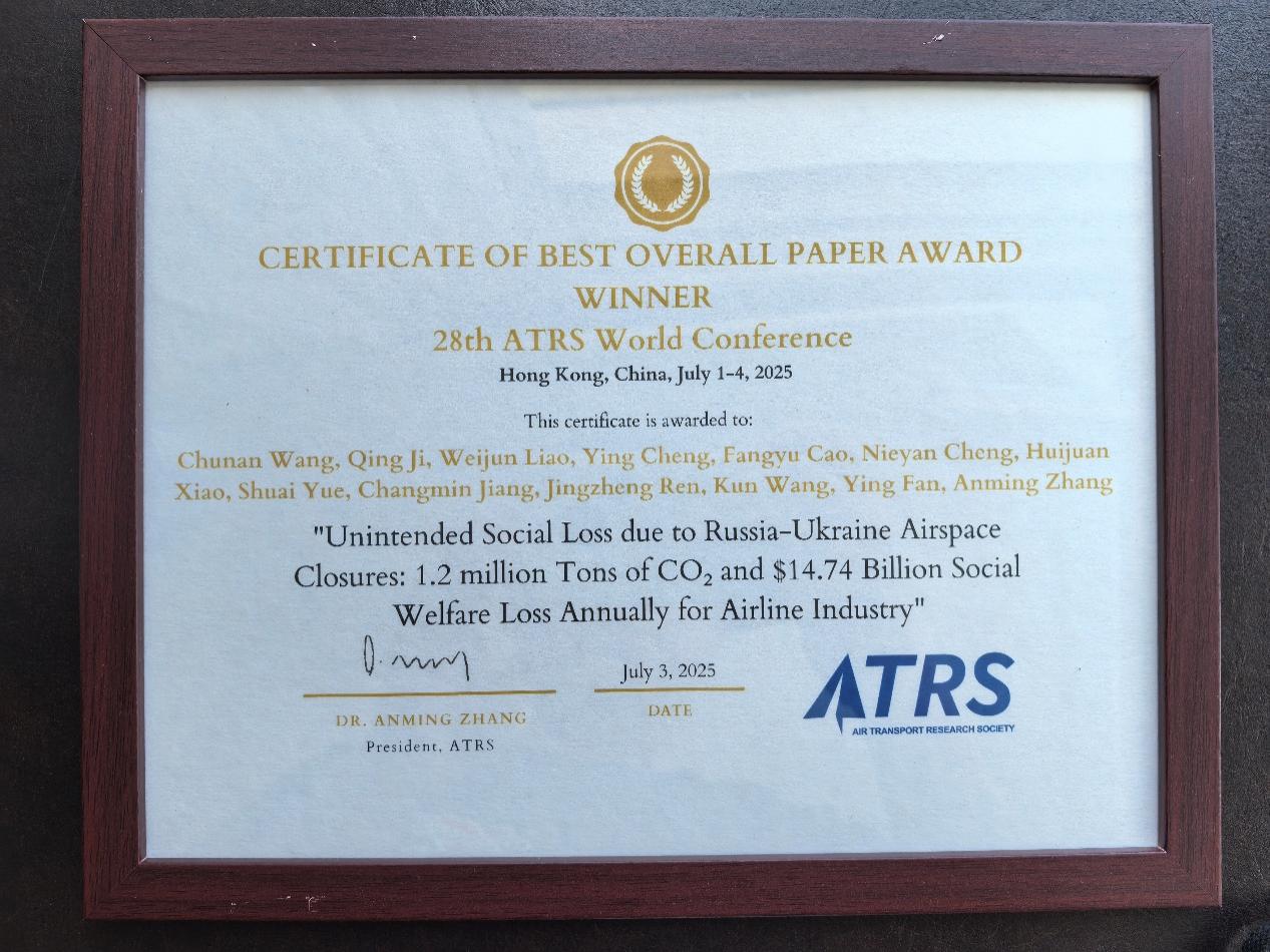 本届会议汇聚了来自全球28个国家和地区的391名专家学者,围绕“迈向更绿色、可持续且具有韧性的航空业”展开了深入交流。经过两轮匿名评审,论文Unintended Social Loss due to Russia-Ukraine Airspace Closures: 1.2 Million Tons of CO₂ and $14.74 Billion Social Welfare Loss Annually for Airline Industry(俄乌空域关闭引发的非预期社会损失:航空业每年额外排放120万吨CO₂并造成147.4亿美元社会福利损失)脱颖而出,荣获本届会议唯一最佳论文奖(Best Overall Paper Award)。最佳论文奖是世界航空运输学会世界大会的最高学术荣誉,旨在表彰对航空领域具有重要贡献的研究成果。
