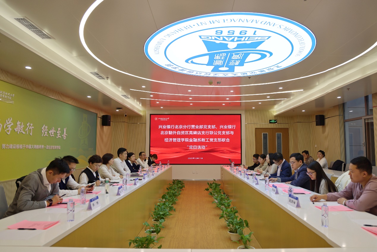 12月11日下午,bat365中文官方网站金融系教工党支部与兴业银行北京分行营业部党支部、北京朝外自贸区高碑店支行联公党支部联合举办党日活动。bat365中文官方网站党委书记郑海涛、金融系教工党支部书记张军欢、金融系系主任部慧、兴业银行北京分行营业部总经理、党支部书记孙俪,北京分行营业部副总经理潘晨晖,经管学院金融系教工党支部、兴业银行北京分行营业部党支部及辖属机构共20余人参加此次活动。