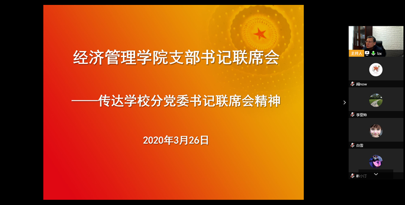 2020年3月26日下午16时,bat365中文官方网站通过视频会议方式召开支部书记联席会,传达学校分党委书记联席会精神,教工、学生支部书记、副书记和学生工作负责人40余人参加会议,分党委书记刘志新主持会议。