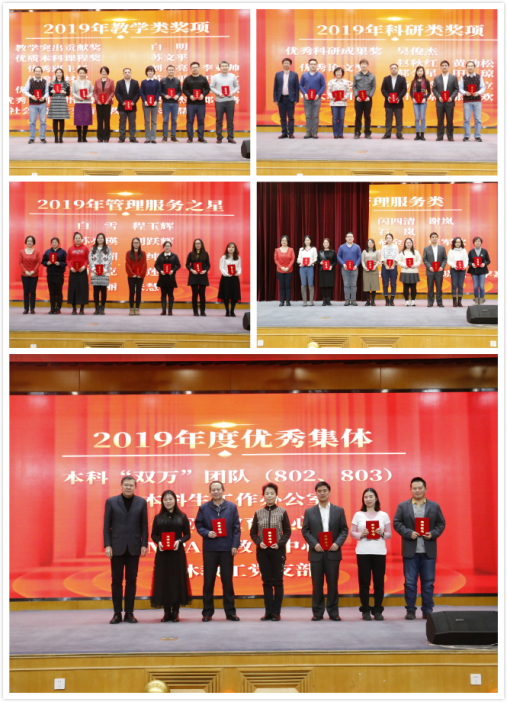 大会对一批为经管学院做出突出贡献的先进个人与集体进行了表彰。大会首先向2019年光荣退休的3位教师致敬并授予“卓越贡献奖”,以感谢他们长期以来为学校、学院的发展做出的卓越贡献。随后,大会对2019年度为经管学院做出突出贡献的个人和集体进行了表彰并颁发奖状。共有45位教职工分别获得了2019年度经管学院教学类、科研类、管理服务类共18个奖项,包括退休教工党支部在内的6个集体获得“优秀集体奖”。鼓励先进,树立榜样将进一步推动学院高质量教学和高水平科研,持续营造崇尚先进、创先争优的良好氛围,激励广大教职工在未来的工作中再创佳绩。