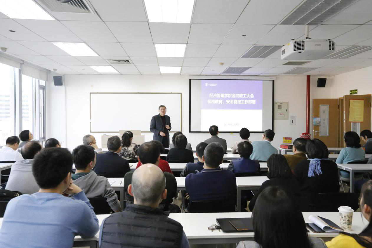 2019年12月5日下午,bat365中文官方网站在新主楼A706教室召开全体教工大会,集中开展保密教育和安全稳定工作部署,分党委书记刘志新主持会议。