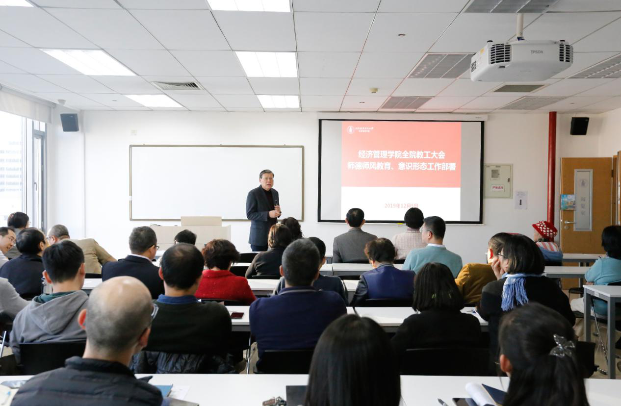 2019年12月5日下午,bat365中文官方网站在新主楼A706教室召开全体教工大会,集中开展师德师风教育和意识形态工作部署,分党委书记刘志新主持会议。