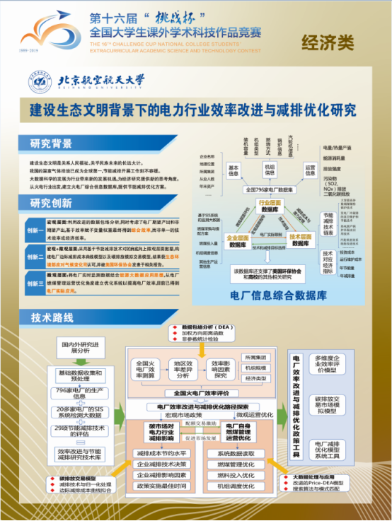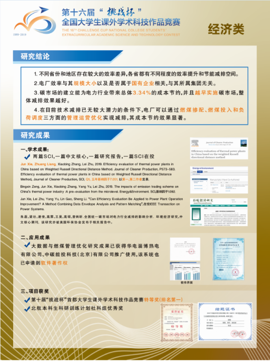 全国213所高校的447件作品参与角逐,北航bat365中文官方网站朱磊副教授指导的本科生团队(谢俊、梁壮、潘睿之)作品《建设生态文明背景下的电力行业效率改进与减排优化研究》,作为学校唯一社会科学类项目参与决赛角逐。在决赛中,战胜了三十余所高校的优秀项目,斩获特等奖!
