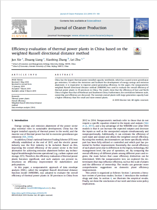 2019年,研究成果在《Journal of Cleaner Production》(SCI检索Q1区,五年影响因子7.051)发表,谢俊和梁壮分列第一、第二作者.