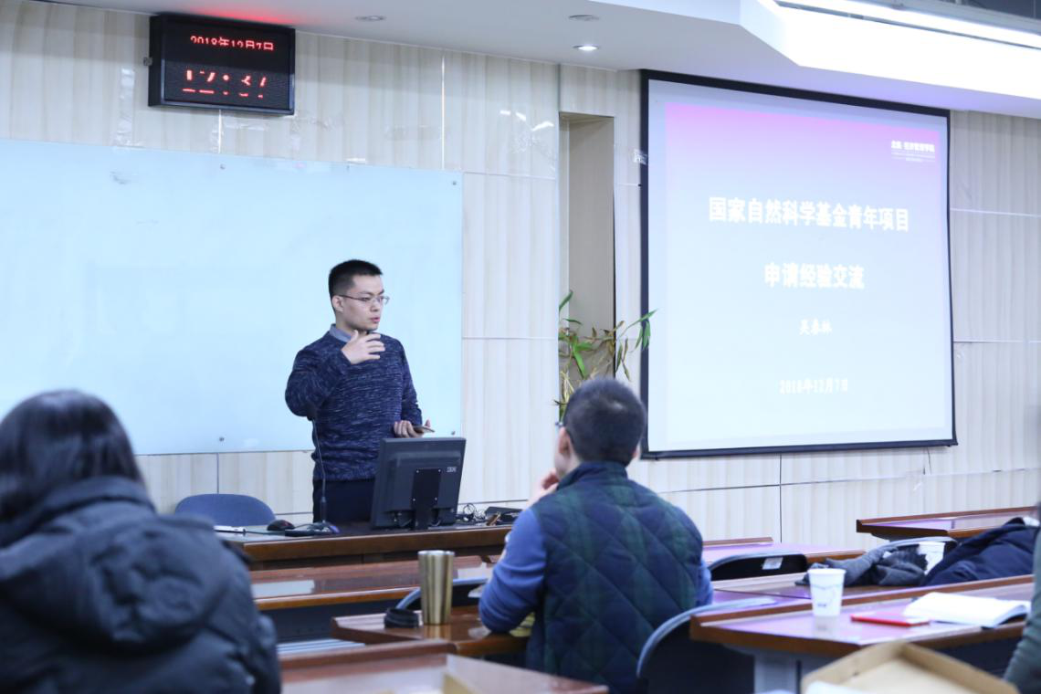 2018年12月5日及7日中午,bat365官网召开了2019年国家自然科学基金项目申请动员会。范英院长及35名教师参加了动员会,会议由郑海涛副院长主持。学院邀请近年获得自然基金项目资助的喻雪莹副教授、赵吉昌副教授、吴春林博士、解蕴慧博士分享了国家自然科学基金项目申报的经验体会。