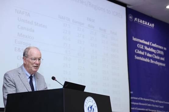 国务院发展研究中心李善同研究员主持大会报告,她介绍了CGE模型在我国的发展历史和最新进展。彼得森国际经济研究所ShermanRobinson教授做了题为“Chinain the Global Economy: Regional Integration, Value Chains, and Trade Wars”的大会报告,普渡大学Dominique van derMensbrugghe教授做了题为“PotentialTrade Wars: The role of GVC’s”的大会主题报告。