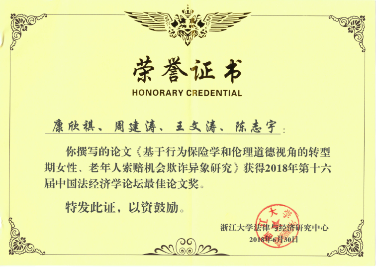 2018年6月30日-7月1日,第十六届(西南政法大学,重庆)中国法经济学论坛举办,北航经管学院周建涛老师与学生合作的论文《基于行为保险学和伦理道德视角的转型期女性、老年人索赔机会欺诈异象研究》获得2018年第十六届中国法经济学论坛最佳论文奖!
