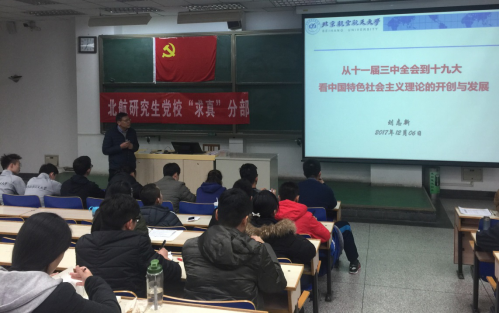 在讲解“理论发展的新时期——习近平时代”时,刘书记总结了习近平新时代中国特色社会主义思想具有三个特征:继承性,创新性,时代性。讲解了从惩治腐败与从严治党的主要举措:从八项规定及反腐到党的群众路线,从“三严三实”到两学一做。刘书记通过案例,让积极分子们了解了新时期规定执行的力度、深度。从一个侧面展开了对新时期的中国特色社会主义思想有一个初步的了解。接着,刘书记又从十八大以来的经济形势、总体布局、思想贡献等方面做了深入的讲述。