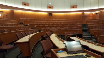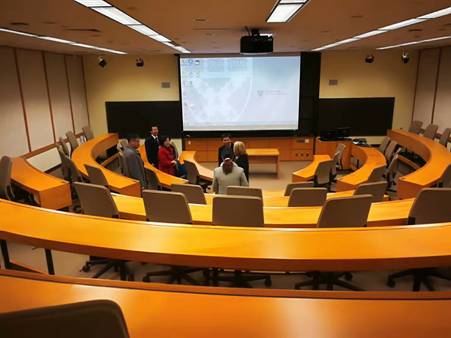 随后,代表团参观了哈佛商学院的案例教室。哈佛商学院有36个经过专业设计的标准化案例教室,以马蹄形、能容纳90人的阶梯教室为主,最大的教室可以容纳180人,也有容纳50人的,几乎全部课程都采用案例教学的方式。还有大小不一的讨论室若干,有开放式的、也有封闭式的,学生们可以自由预约和使用,以配合教学内容的完成。完备的教学设施和融合领先科技的设计,为实现一流的教学质量提供重要硬件支撑。哈佛商学院凭其教学与科研实力成为学界翘楚,与其领先的硬件设施支撑是分不开的。