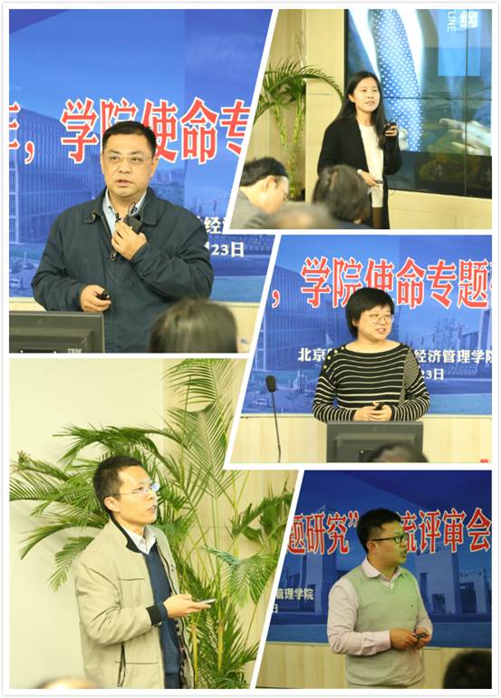 各课题组经过积极的前期准备与广泛的意见征集,集体智慧的碰撞形成了最终的研究成果。评审会上,10位课题组负责人或代表借助PPT对前期的研究成果进行展示,分别就学院使命陈述及其形成过程,学院使命内涵解释,所凝练使命的合理性、恰当性,学院价值观的内容及其作用等进行详细阐述。
