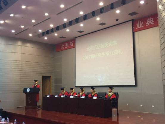 在雄壮的国歌声中,毕业典礼正式开始。党委书记刘志新教授宣读了2017年北京市优秀毕业生获奖名单,副院长牟晖副教授宣读了2017年北航优秀毕业生获奖名单,副院长秦中峰教授宣读了2017年校级优秀硕士学位论文获得者及的导师名单。与会领导和嘉宾为获奖者颁发了荣誉证书。