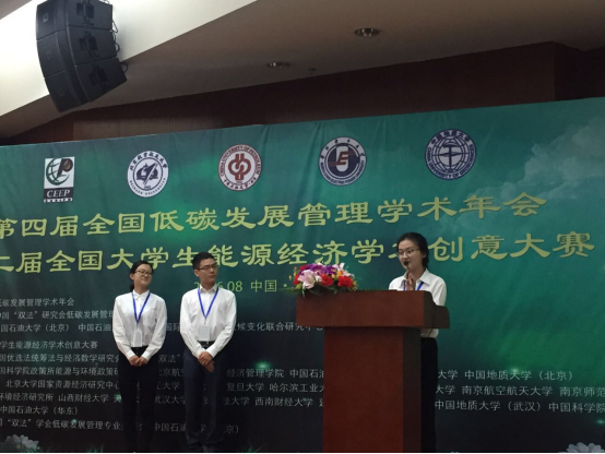 8月21日,由中国优选法统筹法和经济数学研究会低碳发展管理专业委员会主办,中国石油大学(北京)工商管理学院和国际能源经济与气候变化联合研究中心承办,bat365中文官方网站协办的第四届全国低碳发展学术年会在中国石油大学(北京)召开,大会主席为bat365中文官方网站院长、低碳发展管理专业委员会理事长范英教授。本次年会以“能源革命与低碳发展”为主题,探讨能源革命背景下能源系统重塑、能源技术变革、新常态下的低碳能源发展、能源与碳排放等问题。并且同期举办了第二届全国能源经济学术创意大赛,并于8月20日在北京举行了总决赛。我经管学院代表队(刘阳、殷子樵(数学与统计学院)、吕秋娜、蔡立新;指导教师:韩立岩教授)以“高新技术的碳资产及其估值”为题参赛。经初赛评审进入总决赛,成果创新突出,现场表现优异,最终获得一等奖的优异成绩。
