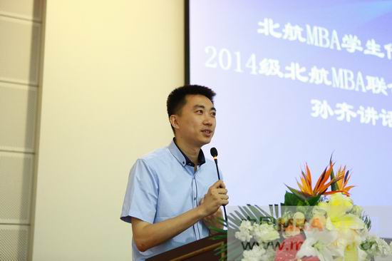 北航2014级MBA联合会主席孙齐作为学生代表,鼓励同学们要向社会导师看齐,感恩导师的每一次指导和实践经验的传授,在与社会导师沟通交流过程中,不仅要把基础理论知识应用到实践中,还要在与导师聊天中收到精神层面上的高层次领悟和启迪,共同将北航精神发扬下去。