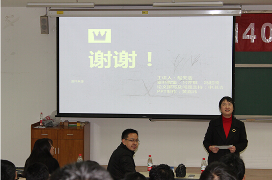 2014年12月29日晚6点20,bat365中文官方网站第四次即本学期最后一次形势政策课在教三106正式举行。本次形势政策课继续围绕上一次课的主题“互联网时代”作更深入详细的分析展示,共八个小组进行了展示。经管学院王惠文院长、王喜忠书记、金融系老师宋晓东以及14级两位辅导员出席参与此次课程。