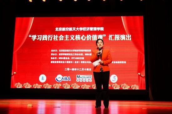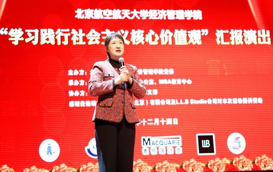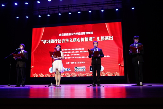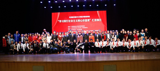 此次汇报演出旨在通过文艺汇报演出进一步更好的将社会主义核心价值观融入到学生学习生活和精神文化生活之中。经管学院院长王惠文教授、党委书记刘志新教授、副院长周宁教授、研究生指导主任牟晖老师、学院党委王喜忠副书记、MBA中心柏满迎主任、李亚帅副主任及陈喆老师、EMBA中心胡鹤副主任、赵颖秀老师、研究生教务刘英老师、研究生工作办公室衣萌老师、金融系主任赵尚梅教授及领导力与组织管理系主任武欣副教授出席活动。北航经管学院全体师生包括本科、普研、博士、MBA共同参加本次演出活动。新浪网教育、腾讯网教育、中国教育在线、中国MBA网、MBA环球网、中国MBA教育网、MBA HOME网等多家媒体来到现场。