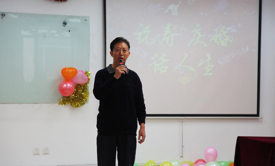 在活动开始之前,经管学院1208党支部的同学们为老人们佩戴了红花。本次活动的主角是十二位寿星和一对白金婚,一对钻石婚和四对金婚的老人们。同学们为他们赠送了精美礼品,祝愿寿星们健康长寿,祝愿白金婚,钻石婚,金婚的老人们幸福美满,生活多姿多彩!参加这次庆典活动的退休教工党支部的李清书记,校离退休处分党委副书记白瞾宇,经管学院党委副书记王喜忠,校关工委副主任曾妙南,经管学院党委书记刘志新老师分别致贺词。刘书记代表经管学院党委和院领导向在场的各位老同志表示祝贺并简单介绍了经管学院近年来的发展与成就,特别强调了这些成就中离不开老一辈同志打下的基础和作出的贡献,也感谢老一辈同志们关心下一代,不断为经管学院的发展付出心血。刘书记讲话中的字字、句句感人肺腑,温暖着每一个离退休同志的心。他还代表经管学院向在场的寿星和白金婚,钻石婚,金婚夫妇赠送了礼品和红包。