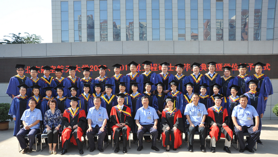 王玉灵宣读获得工程硕士学位研究生名单后,在欢快喜庆的乐曲声中,同学们身着学位服盛装逐一上台,由谭振亚、周宁、张人千三位教师为毕业研究生授予学位,并与同学们合影留念。
