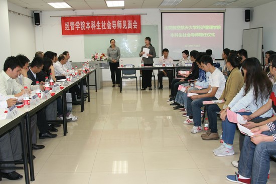 2013年9月28日星期六上午9时,北航经管学院本科生社会导师见面会暨聘任仪式在北航新主楼A1048正式拉开帷幕。参加本次聘任仪式的有北航经管学院院长王惠文教授,北航经管学院党委副书记高翔老师,北航经管学院职业发展中心主任牟晖老师,担任本科生社会导师的北航MBA校友,职业发展中心、MBA中心的老师,2011级本科辅导员,同时还有来自北航经管学院2011级的34名参与导师计划的优秀本科生。