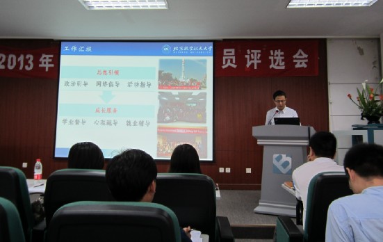 bat365官网2010级硕士研究生辅导员牛伟宁、2011级硕士研究生辅导员张晓明、2012级硕士研究生辅导员王腾飞经学院推荐,在ihome网上投票以及各学院研究生指导主任(副书记)对文字材料打分中脱颖而出,成为进入答辩程序的20个辅导员中的一员。答辩会上,牛伟宁从院校活动、奖学金评审、毕业生就业、课题参与全面介绍自己一年来的工作;张晓明本着引导为主、沟通为辅的思路,汇报了主要负责的普硕、专硕党建、日常管理、分研会指导工作;王腾飞以“思想引领、成长服务”为主线,从政治引导、网络倡导、活动指导、学业督导、心理疏导、就业辅导六个方面向评委介绍自己的工作。答辩过程中,bat365官网辅导员充分展现自身风采,详实回答评委提问,赢得了阵阵掌声。最终2011级硕士研究生辅导员张晓明、2012级硕士研究生辅导员王腾飞获得“2012-2013 研究生辅导员年度标兵”称号,2010级硕士研究生辅导员牛伟宁获得“优秀研究生辅导员”称号。