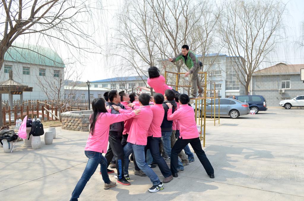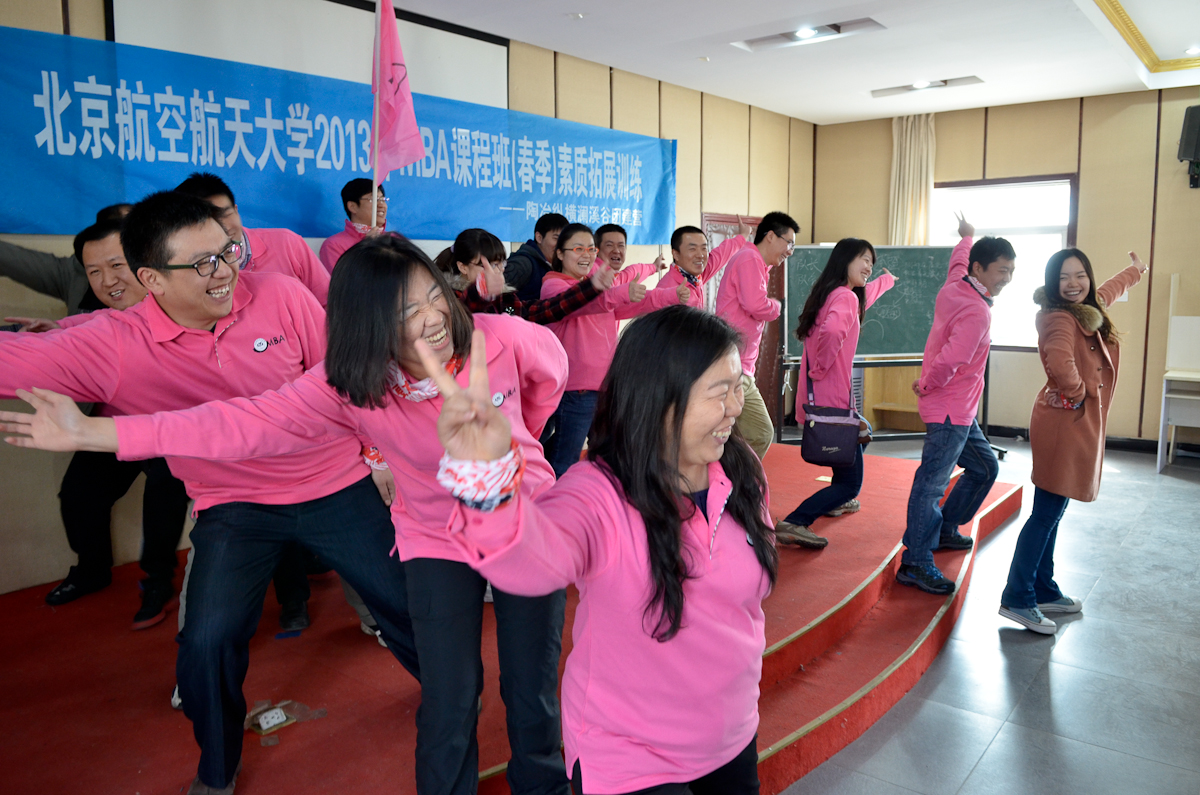 早上7:30学员集合完毕。在行车途中,领队为每位学员赠送了一条魔术头巾,并带领大家一同学习多种头巾穿戴方式:围脖、手机套、汗巾、游泳帽、打劫帽等等。之后每位学员做了自我介绍。经过1小时30分钟的车程,顺利到达目的地。稍作休整后,首先举行了北航2013级MBA课程班学员的破冰起航仪式。学员们在拓展训练教练的带领下,划分为两个团队,并分别为自己的团队起名为“老A”和“钻石”。随后,学员设计了团队宣言、队旗、队歌等一系列团队活动。通过破冰,学员们相互熟悉,气氛融洽,并期待即将到来的拓展活动。