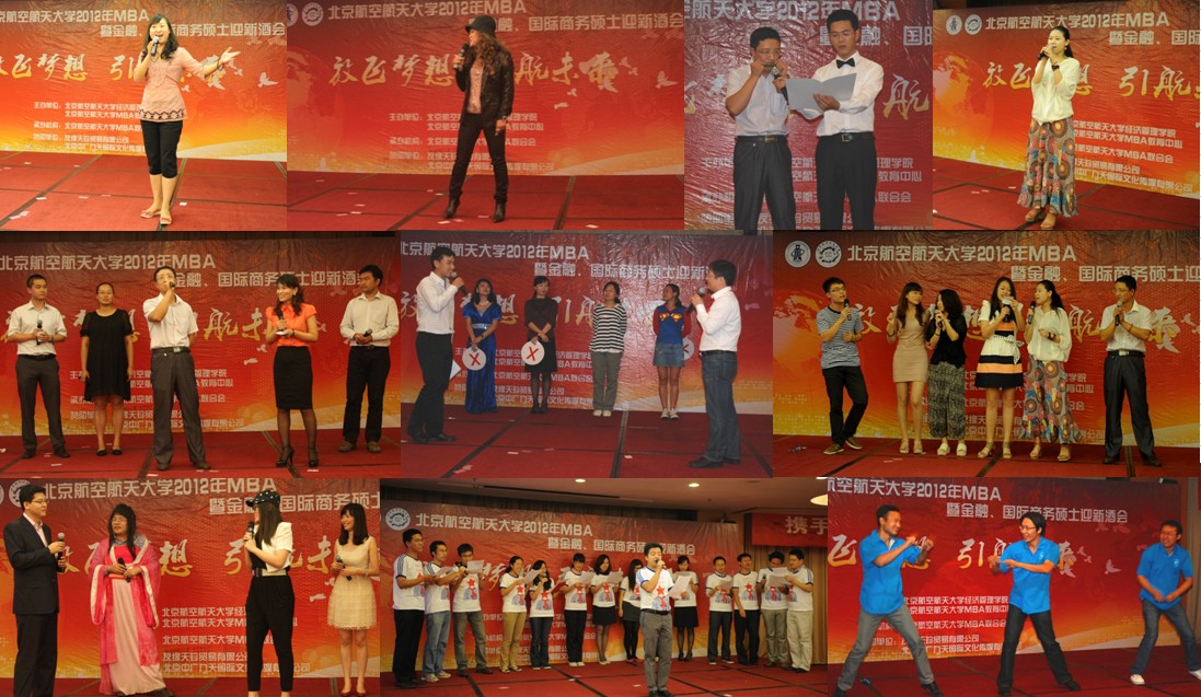北航MBA迎新酒会一向精彩纷呈,12级MBA新生已经提前开课,并经过了拓展训练洗礼,相较而言大家之间已经非常熟悉;金融、国际商务硕士新生的积极参与,更令酒会气氛倍加热烈,精彩节目连连不断。舞台剧《华府招亲》、《非诚勿扰》、《新生报到》、双簧《约会》、三句半《齐聚北航》,内容精彩,贴近社会热点,又结合北航MBA学生生活,在幽默诙谐的表演中显现出MBA同学们满腹的才华,引得现场阵阵笑声和掌声;独唱《Baby once more time 》、法语独唱《Le Temps Du Muguet》、合唱《让我们荡起双桨》、《爱因为在心中》、《我相信》、《北航好声音》、《听是谁在唱歌》、《京典串烧》、《流行歌曲串烧》用一首首熟悉的歌曲,展现了同学们的好歌喉,也引起现场观众的共鸣;舞蹈《抓钱舞》、诗朗诵《我的团队我的团》等节目百花齐放,或动感、或激情、或深情,总让在场师生在笑声中拍手欢呼。衣萌老师代表经管学院教师上台演唱了《好日子》,并向同学们许下美好祝愿。晚会在《相亲相爱一家人》的合唱中落下帷幕,所有的老师们和学生们合影留念,纪念这美好的一晚。